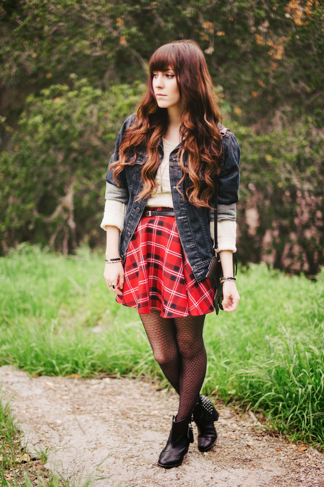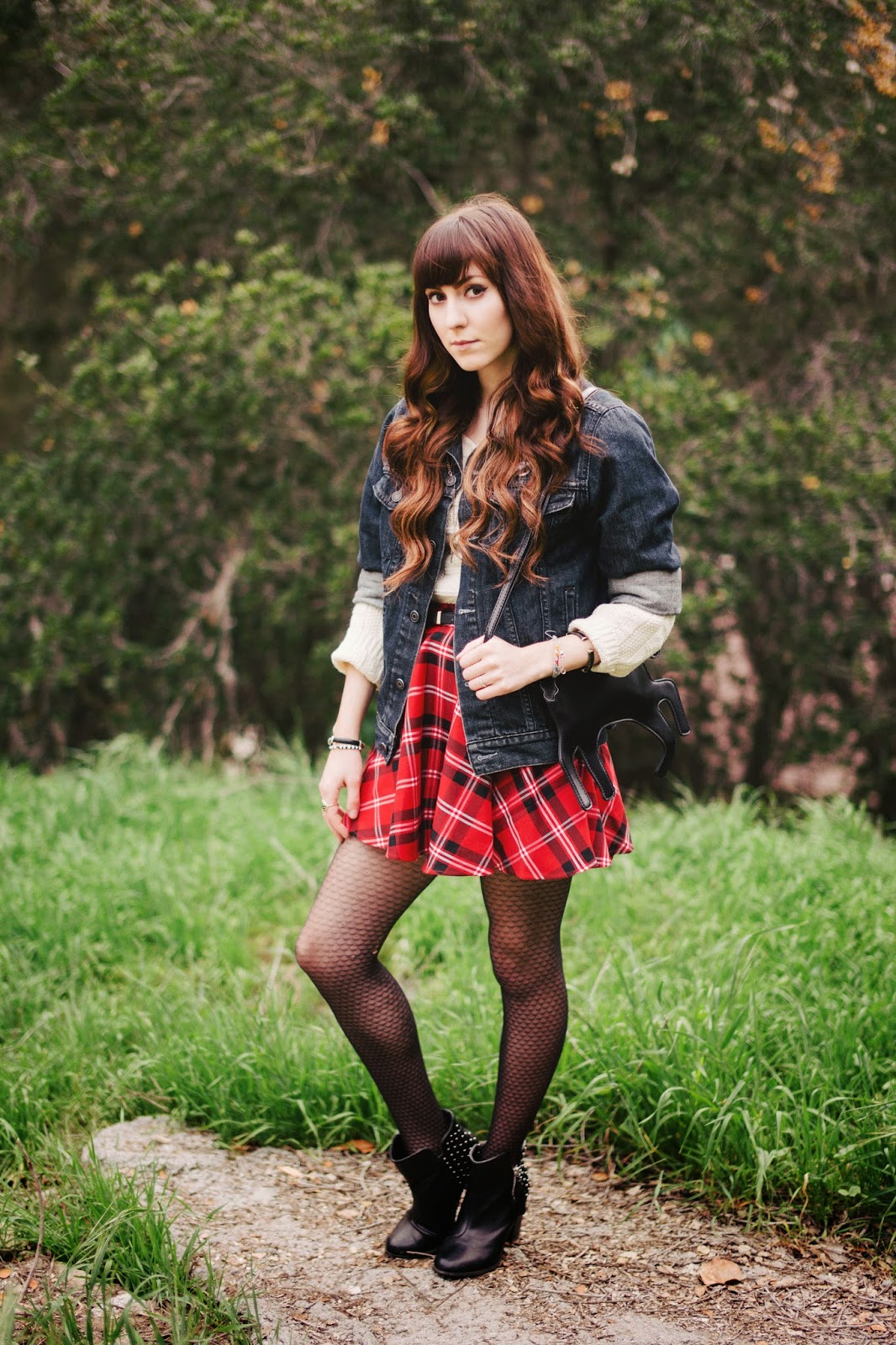 Horse bag- Chicwish, plaid skirt- Chicwish, tights and dress- Hot topic, denim jacket- boyfriend, boots- Forever 21, sweater- vintage